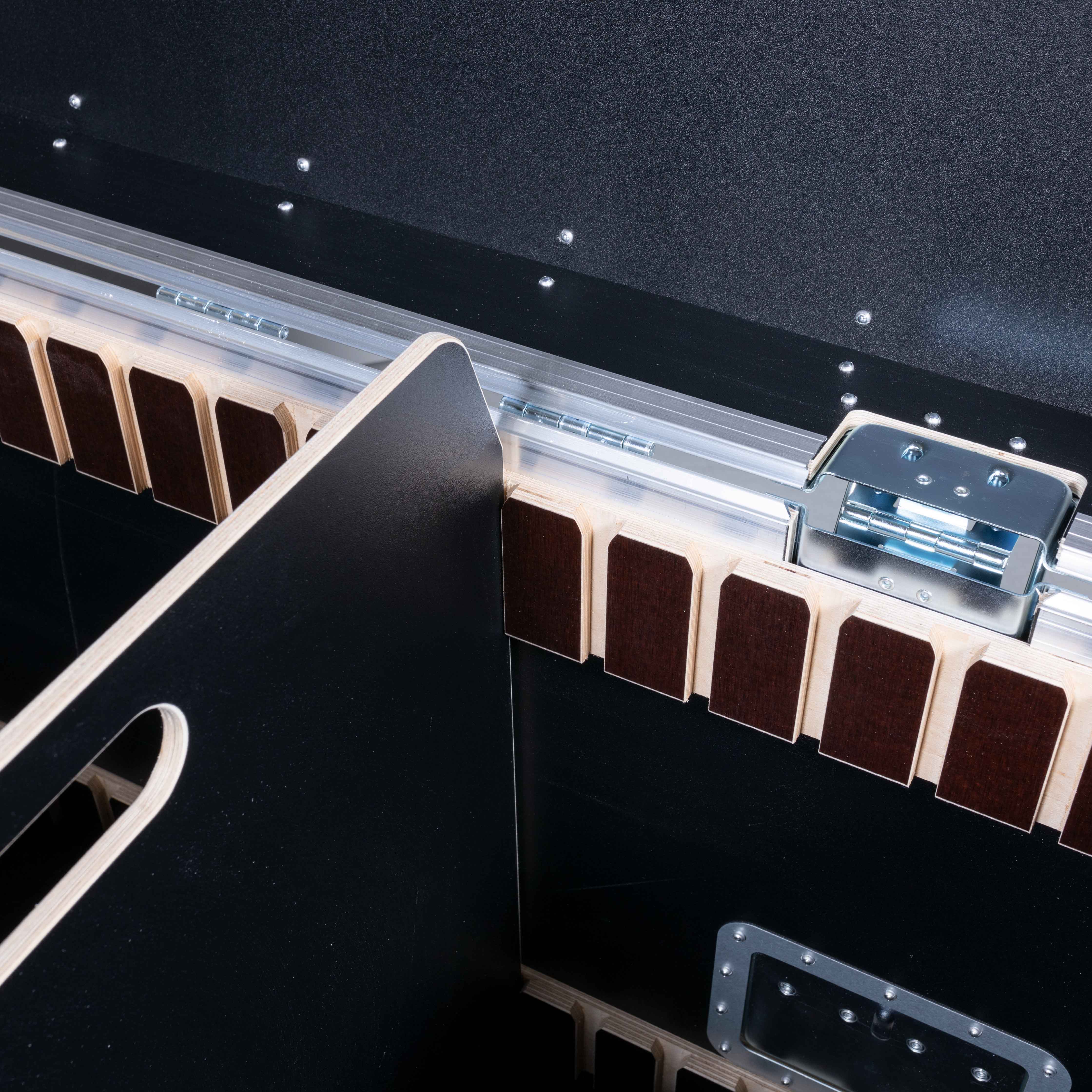 Flexibel, robust und vielseitig einsetzbar 10mm Birkenmultiplexholz, 35mm Aluminiumkantenschutz, große Kugelecken mit dreifach Vernietung pro Schenkel, große Deckelaufsteller, große Klappgriffe und große Butterflyverschlüsse machen dieses Produkt zu einem der zuverlässigsten robustesten und Flightcase für den täglichen Roadeinsatz.