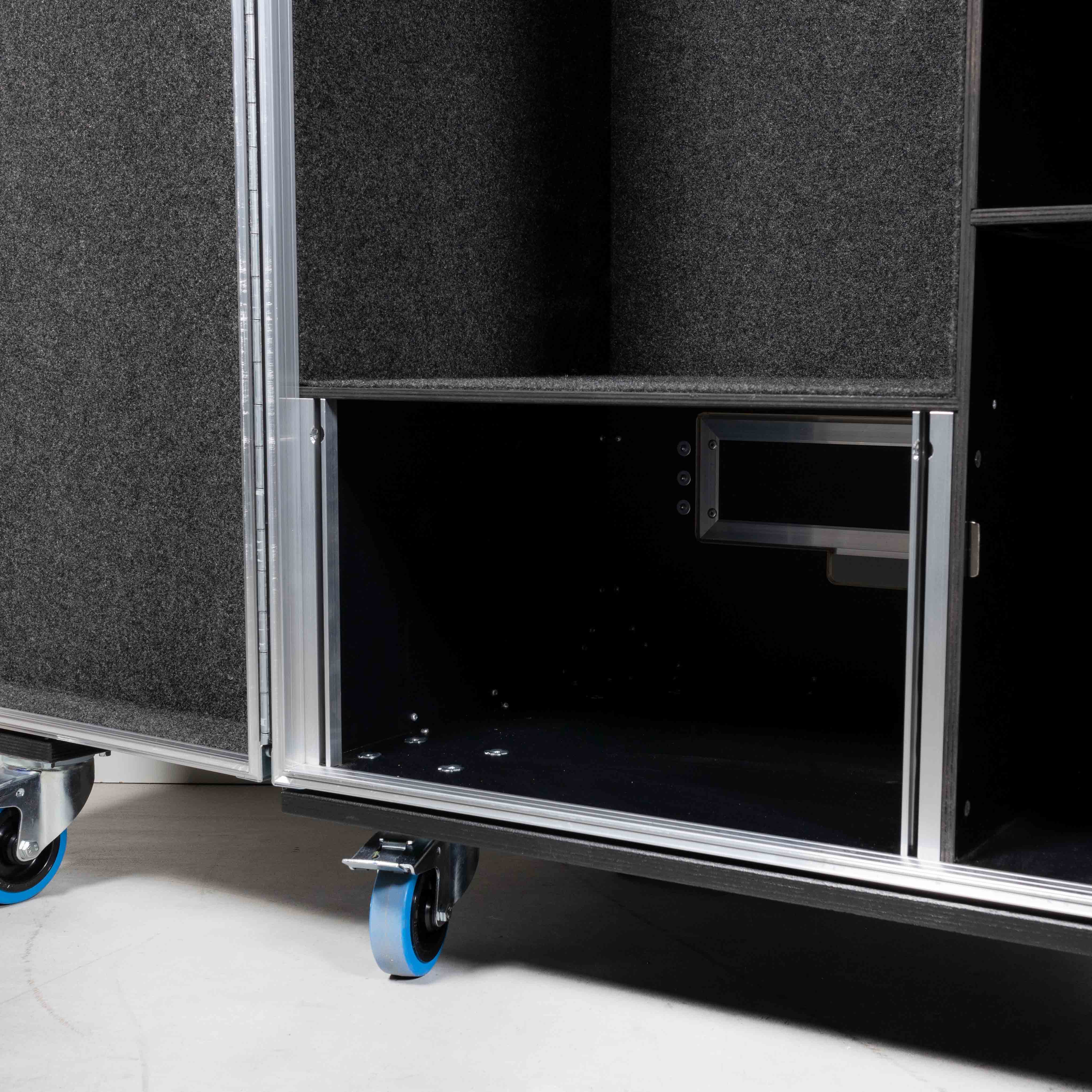 unten mit 19" Einheit für 2x3HE Rackschublade, oberste 3HE rückseitig über Serviceklappe zugänglich mit Kabelauslss (Borsten)