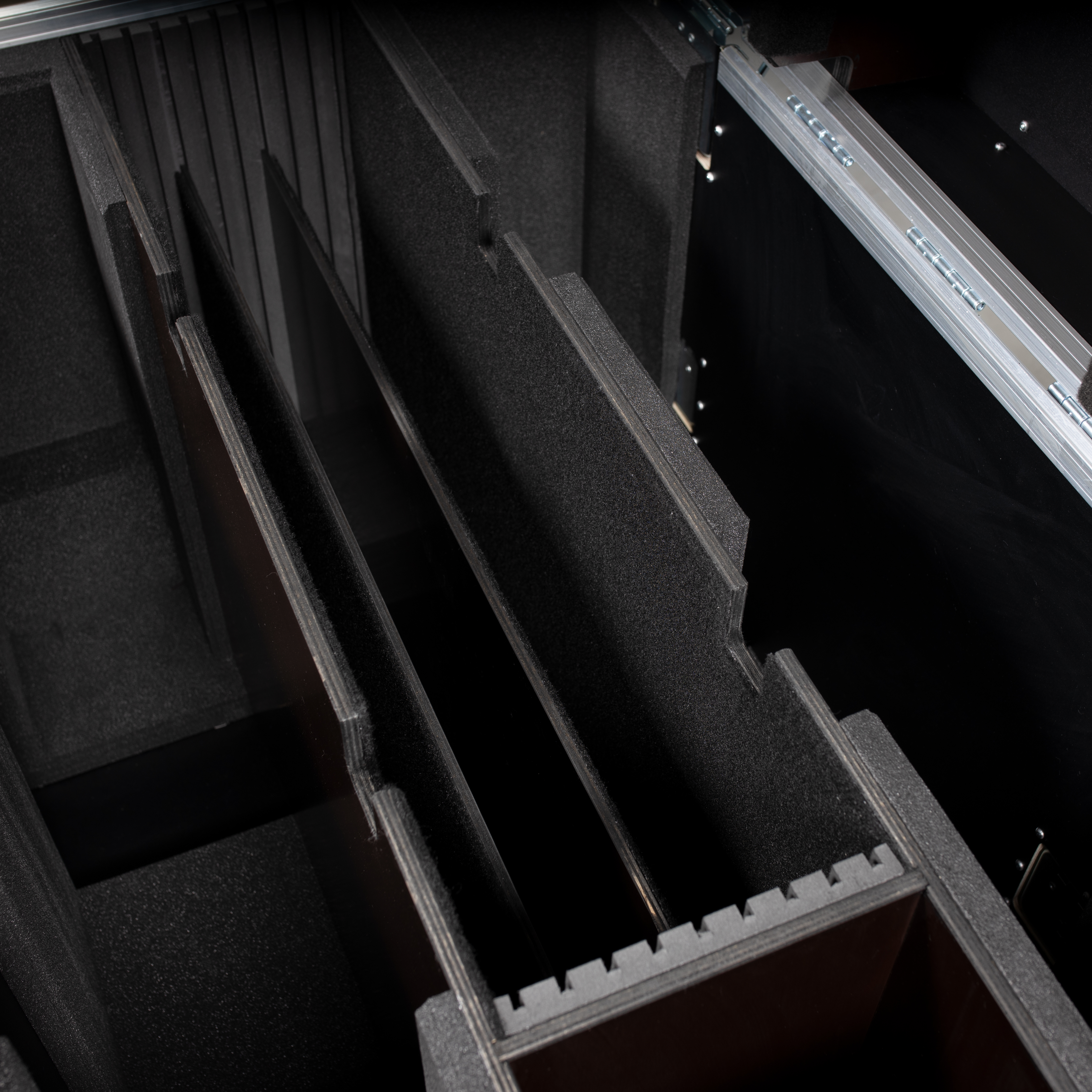 mittig ein Zubehörfach mit Nutenschaum und zwei Trennwänden,