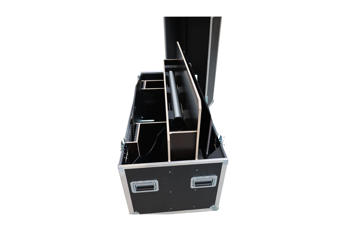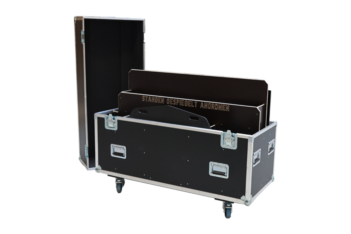 mittig ein Fach für 2 übereinander liegende Stativstangen (+1y Verlängerung) mit gepolsterten Trennbretter zwischen den Stativstangen,