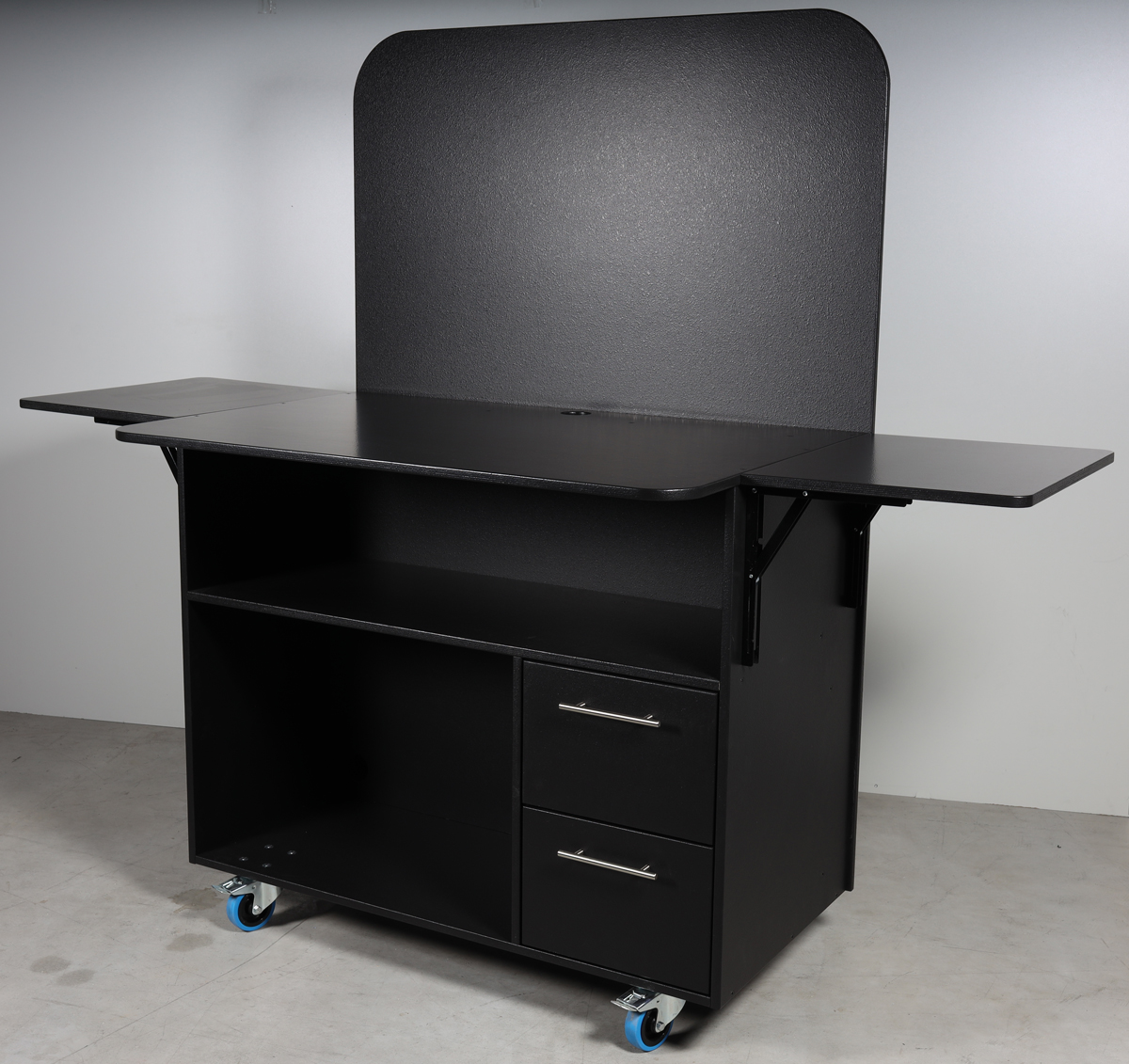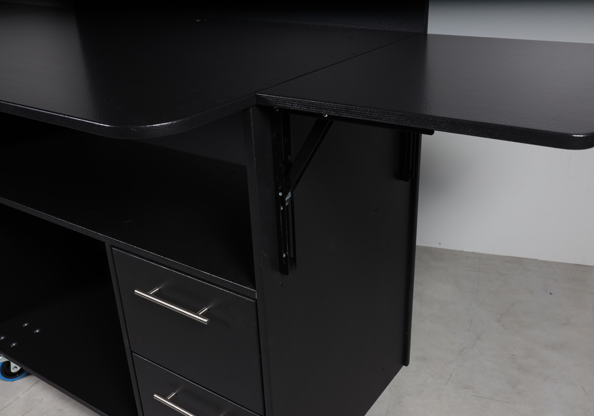 seitlich mit klappbaren Arbeitsflächen, Rückseite erhöht mit Montagemöglichkeit für Monitor,