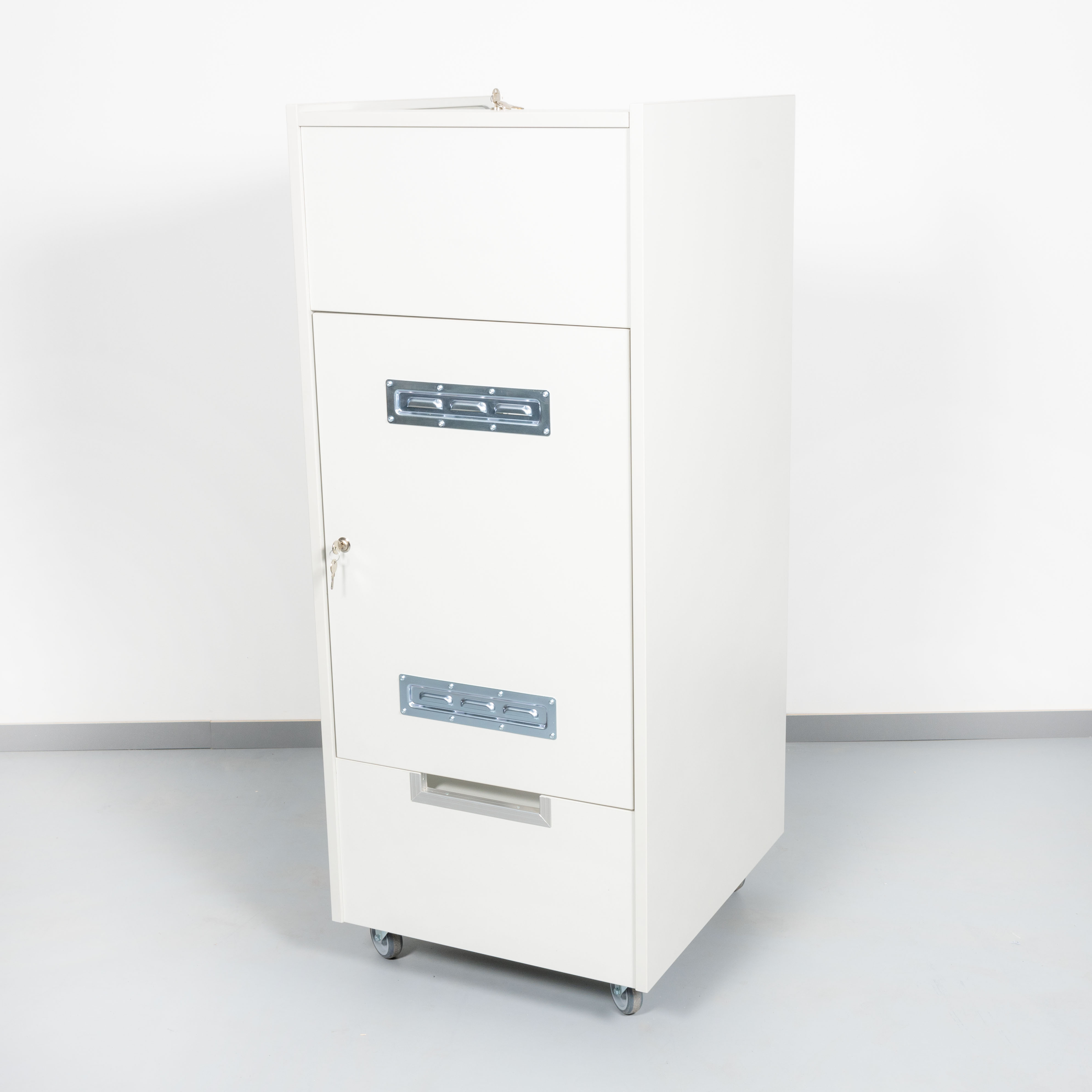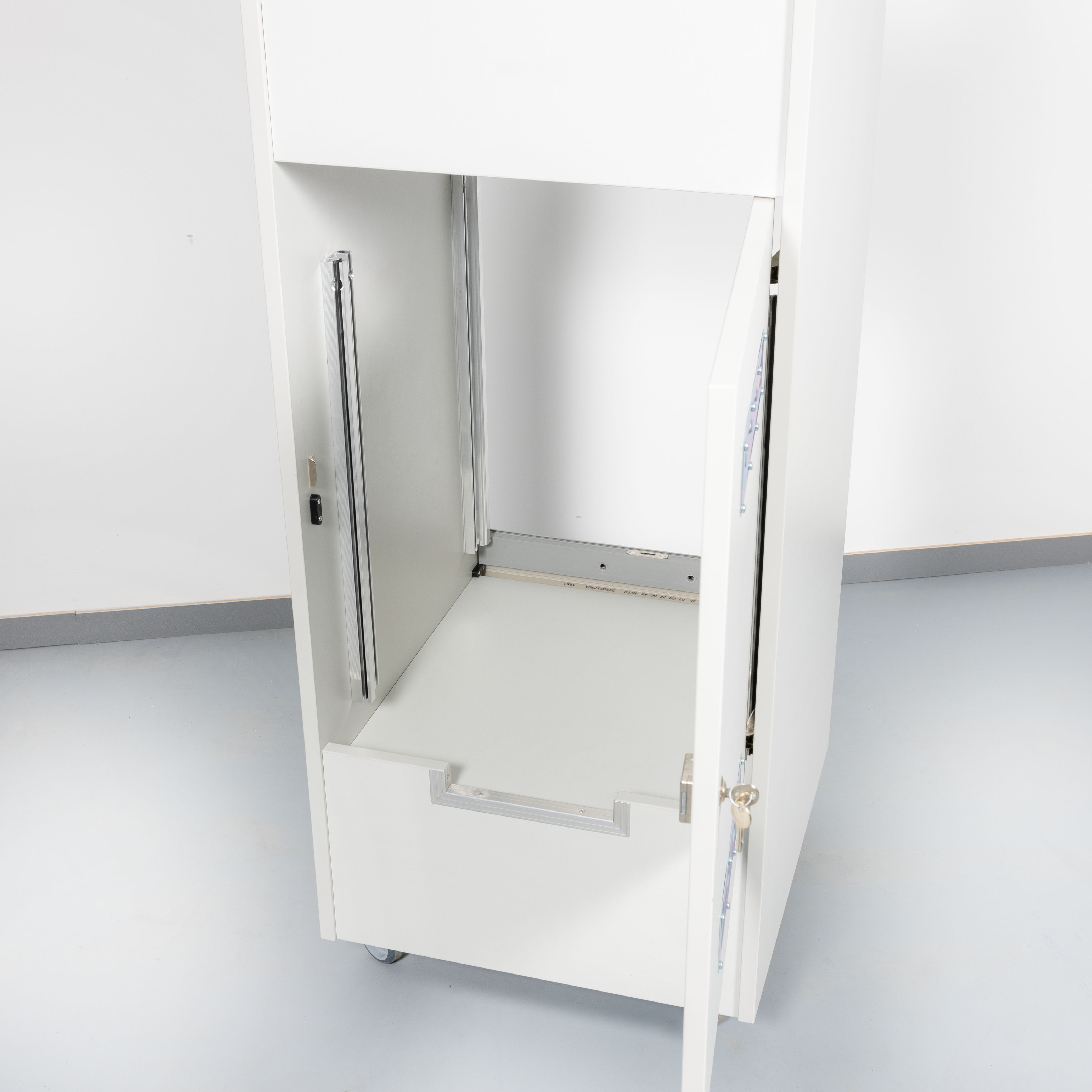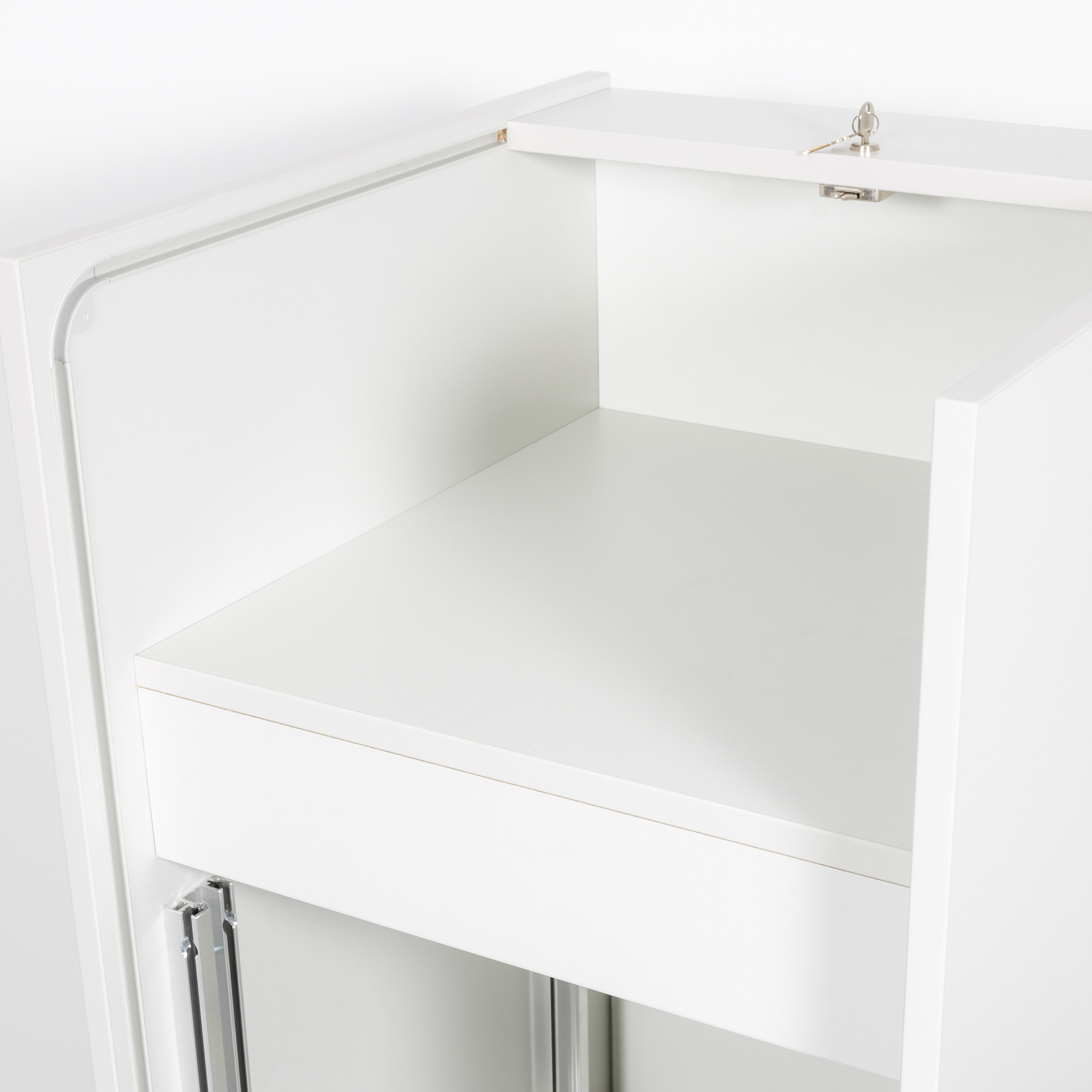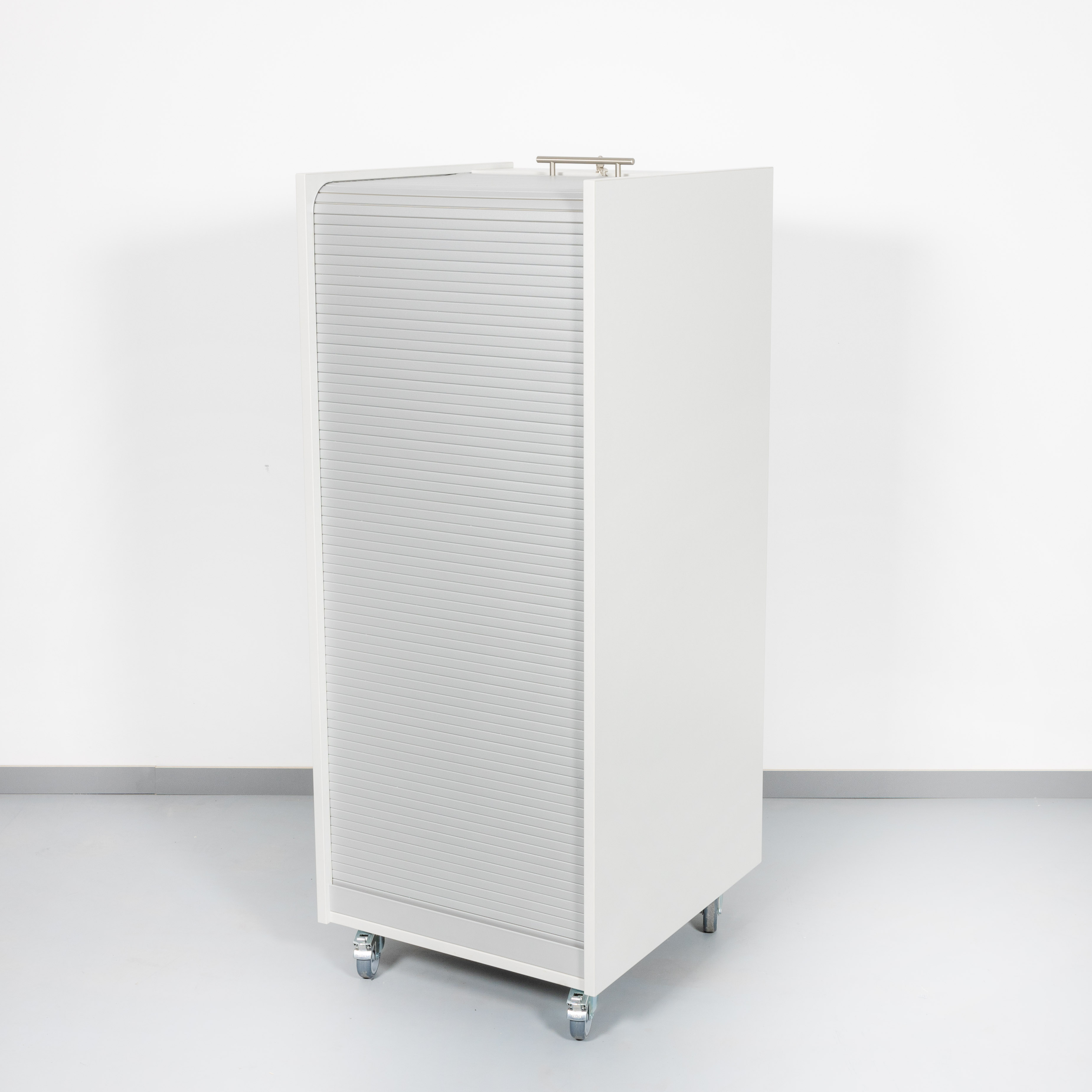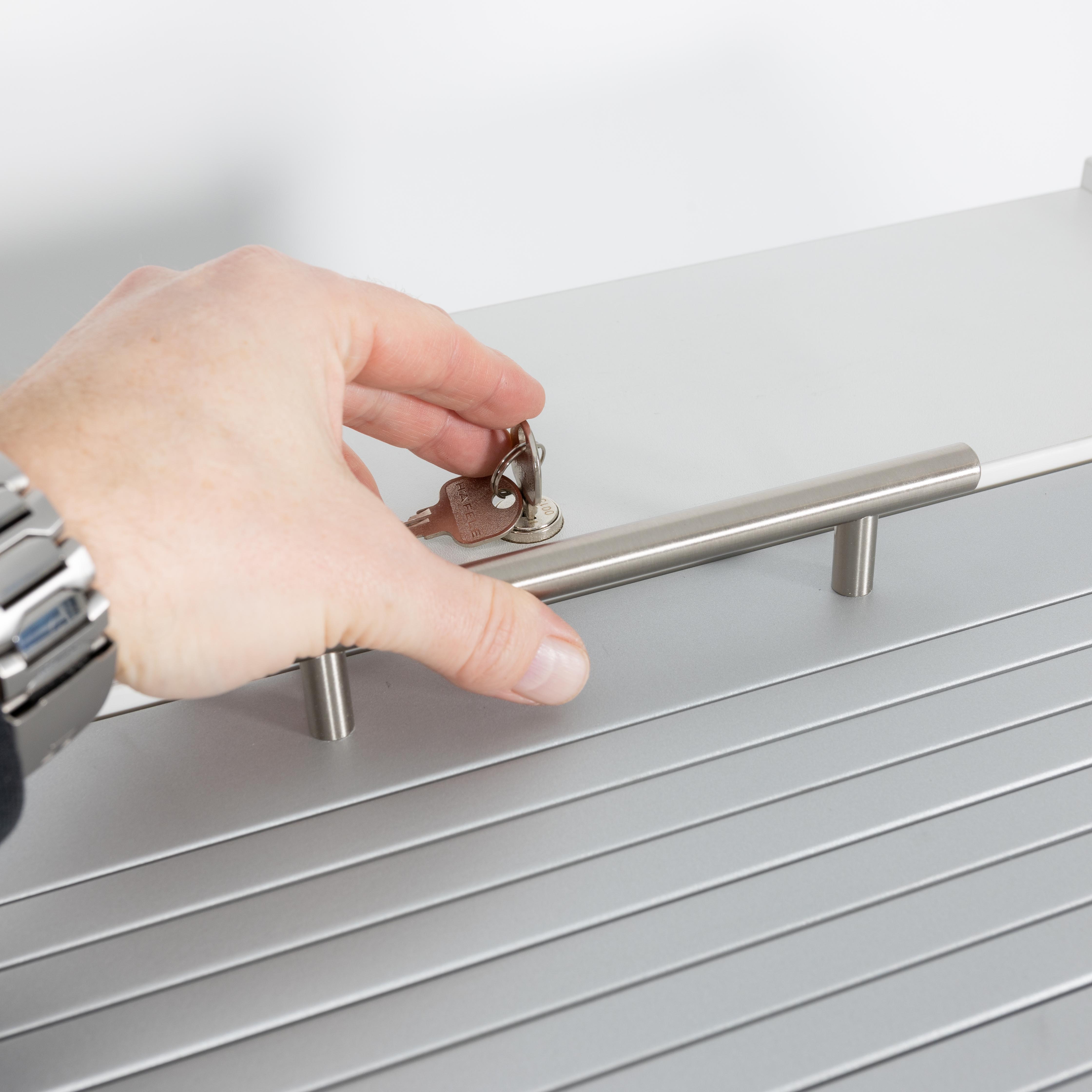 Abschließbare Rollade: Die Vorderseite und der obere Bereich werden durch eine leichtgängige Aluminium-Rollade geschützt. Das Schloss befindet sich diskret an der Oberkante, um wertvolle Technik vor unbefugtem Zugriff zu bewahren.