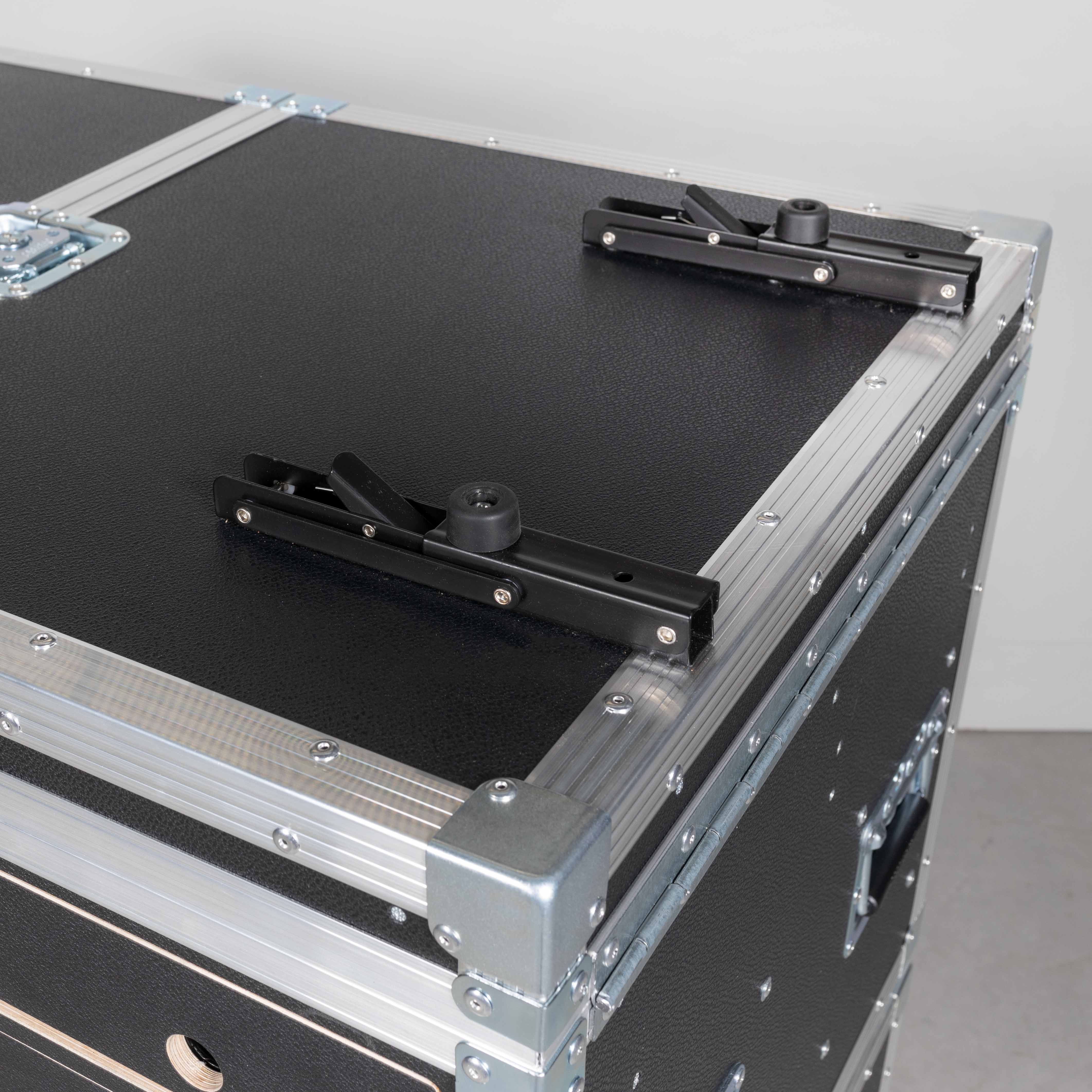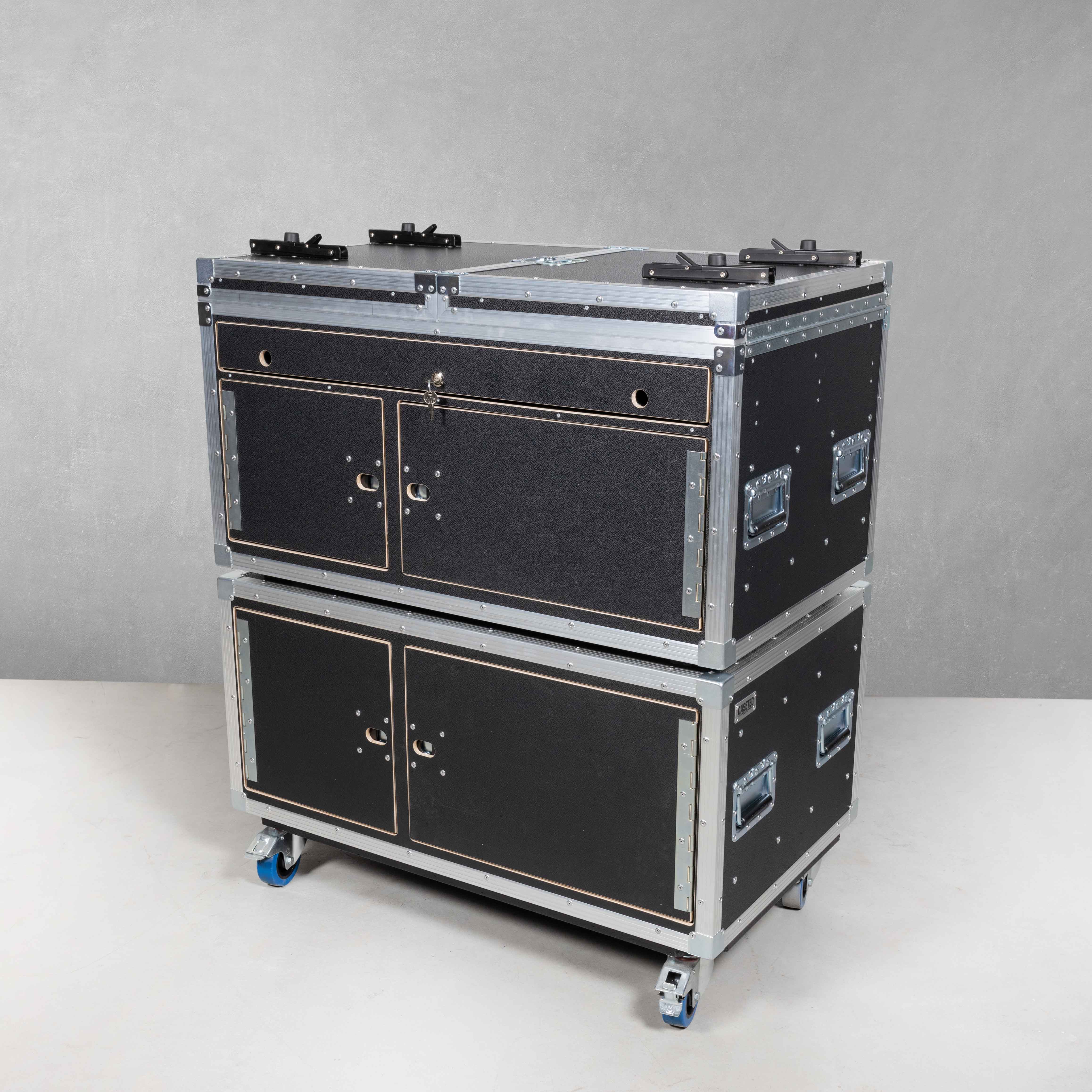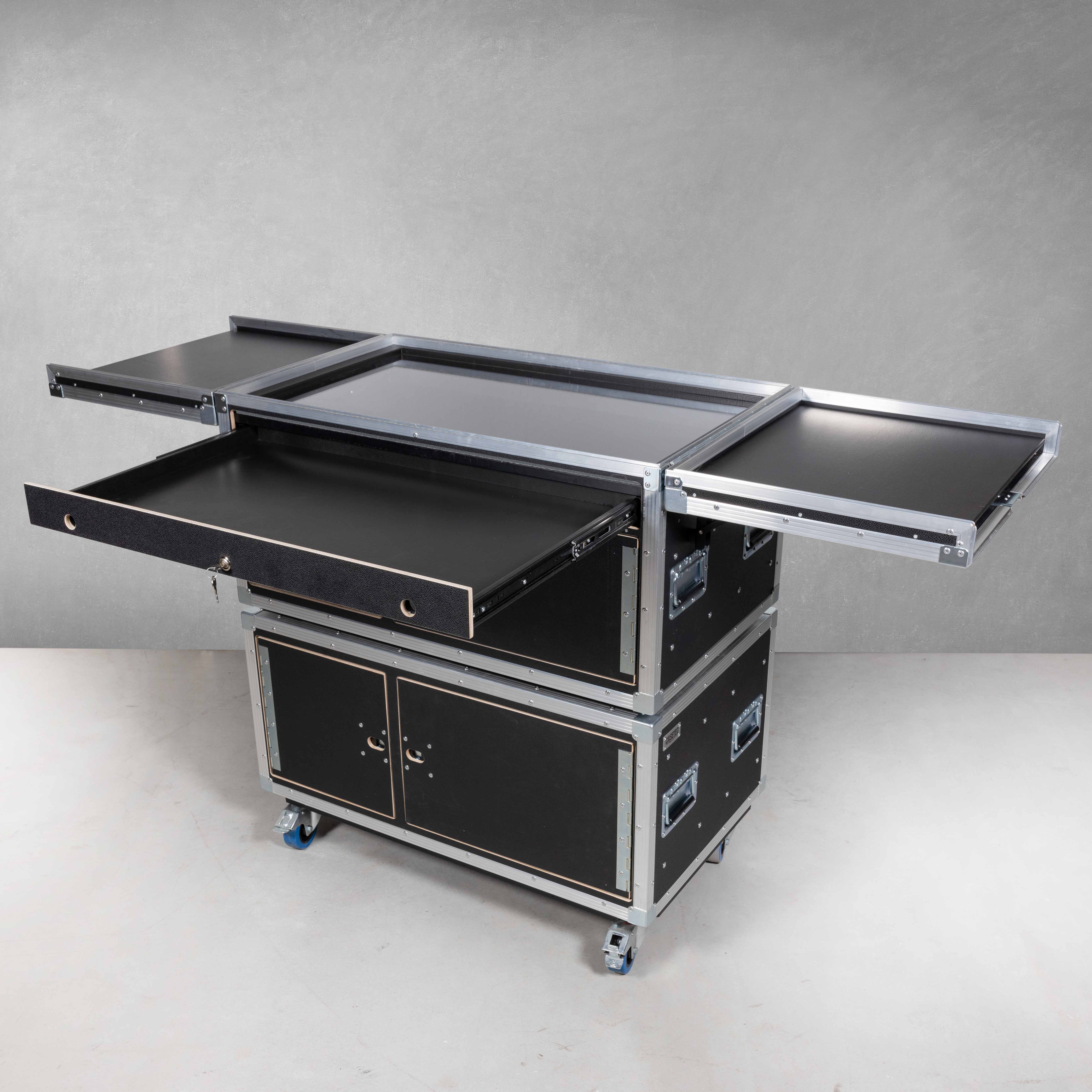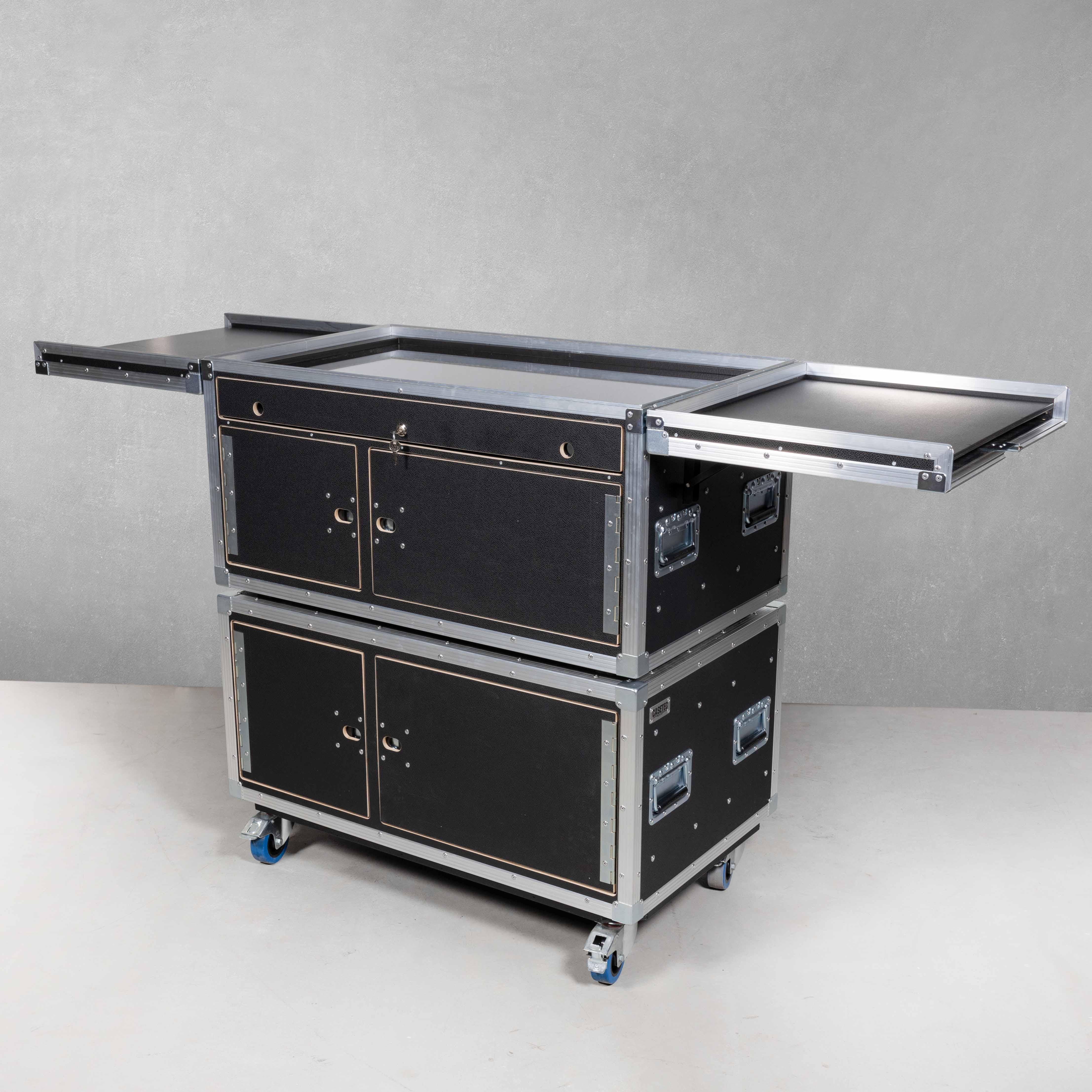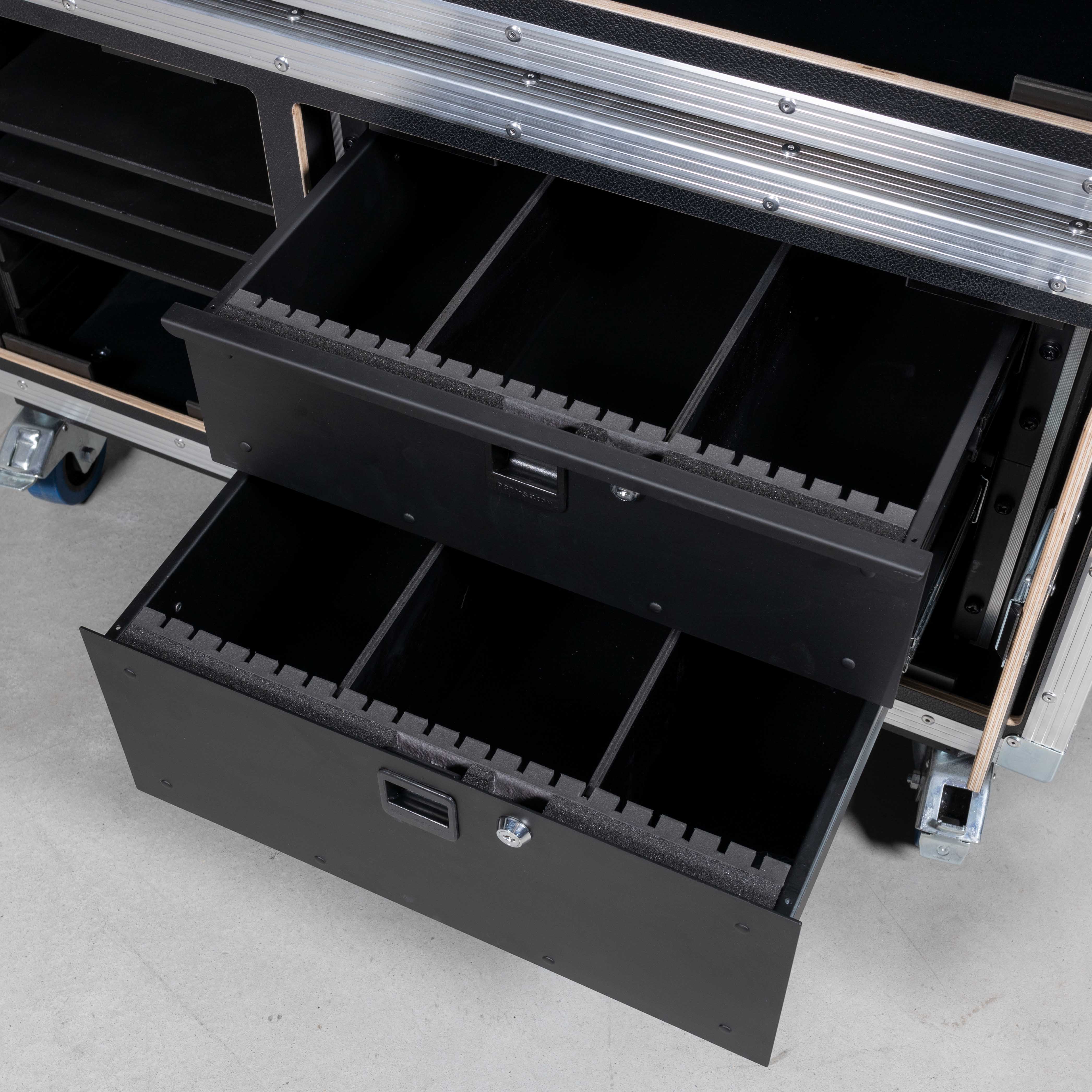 stapelbar mit Case oben, Deckel zum Einschieben, linkes Fach mit 3 verstellbaren Trennwänden, rechtes Fach mit 19" Racksschienen inkl. einer 3HE Rackschublade und einer 4HE Rackschublade (beide Laden mit Nutenschaum und zwei variabel steckbaren Trennwänden bestückt)
