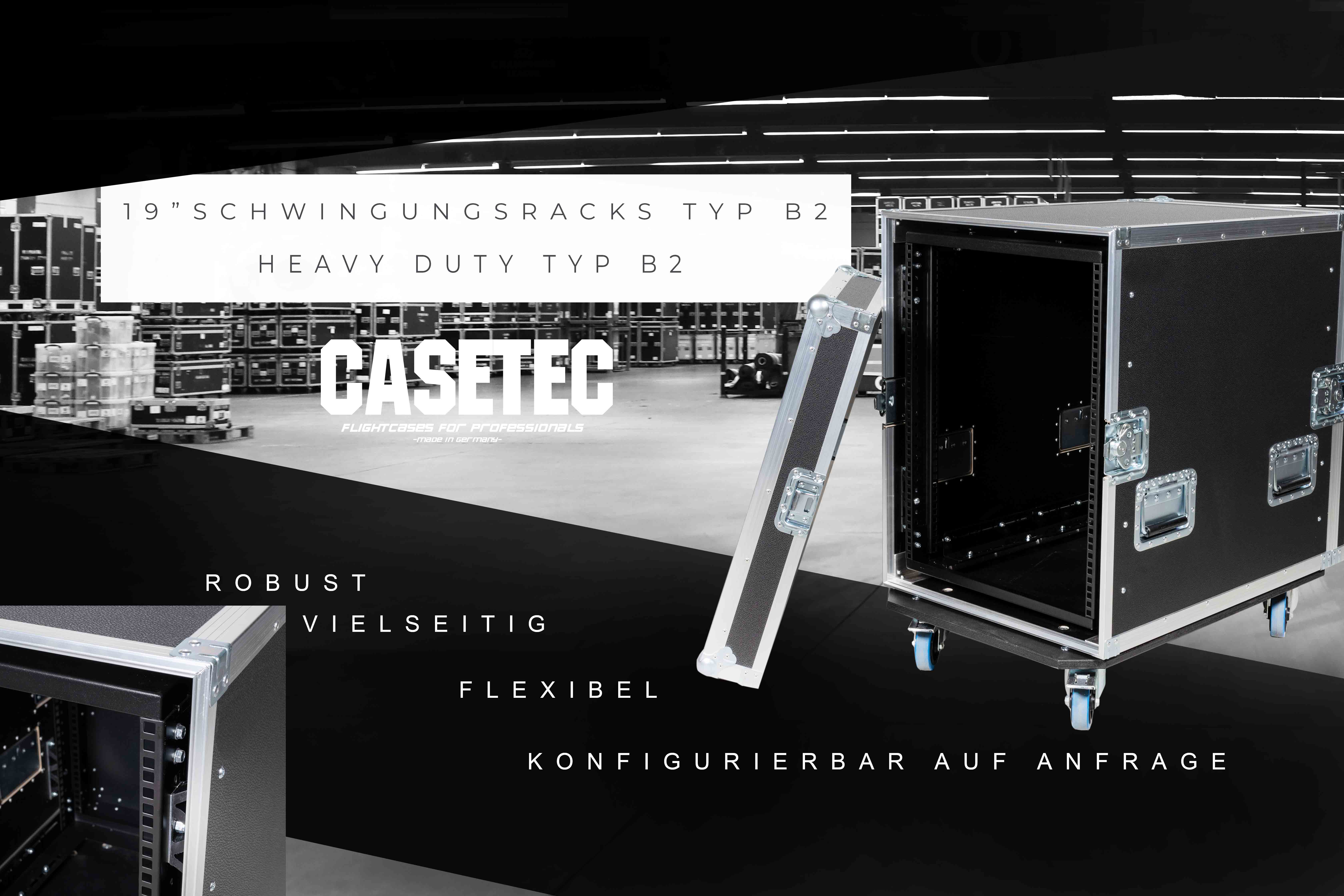 Dieses 19" Schwingungsrack Typ B2 Professional ist die ultimative Festung für Ihre sensible Elektronik. Ob High-End-Server, empfindliche Endstufen oder präzise Messtechnik – dank des gefederten Schwingrahmensystems bleibt Ihr Equipment selbst bei härtesten Tour-Bedingungen oder holprigen Transportwegen unversehrt.19" Schwingungsrack Typ B2 Professional – 12HEMaximaler Schutz durch „Case-im-Case“-SystemDas Herzstück dieses Racks ist der stabile 19" Schwingungsrahmen aus Stahl. Durch spezielle Dämpfer ist das Innengestell vom Außengehäuse entkoppelt. Stöße und Vibrationen werden absorbiert, bevor sie Ihre Hardware erreichen. Mit einer Einbautiefe von 705 mm bietet es zudem reichlich Platz für tiefes Equipment.Robustheit ohne KompromisseGefertigt aus 10,0 mm Birkenmultiplex und veredelt mit einer kratzfesten ABS-Beschichtung, trotzt dieses Case mechanischen Einwirkungen. Der 35 mm Aluminiumkantenschutz und die massiven Stahl-Kugelecken sorgen dafür, dass das Rack auch nach Jahren im Einsatz noch eine gute Figur macht.Handling & MobilitätTrotz seiner massiven Bauweise bleibt das Rack manövrierfähig:Rollbrett-System: Montiert auf einem stabilen Board mit 100 mm Lenkrollen (davon zwei mit Feststellbremse).Tragekomfort: Vier große, bündig eingelassene Klappgriffe ermöglichen ein ergonomisches Handling.Verschlusssystem: Vier hochwertige Butterfly-Verschlüsse sichern die vorderen und hinteren Deckel zuverlässig.