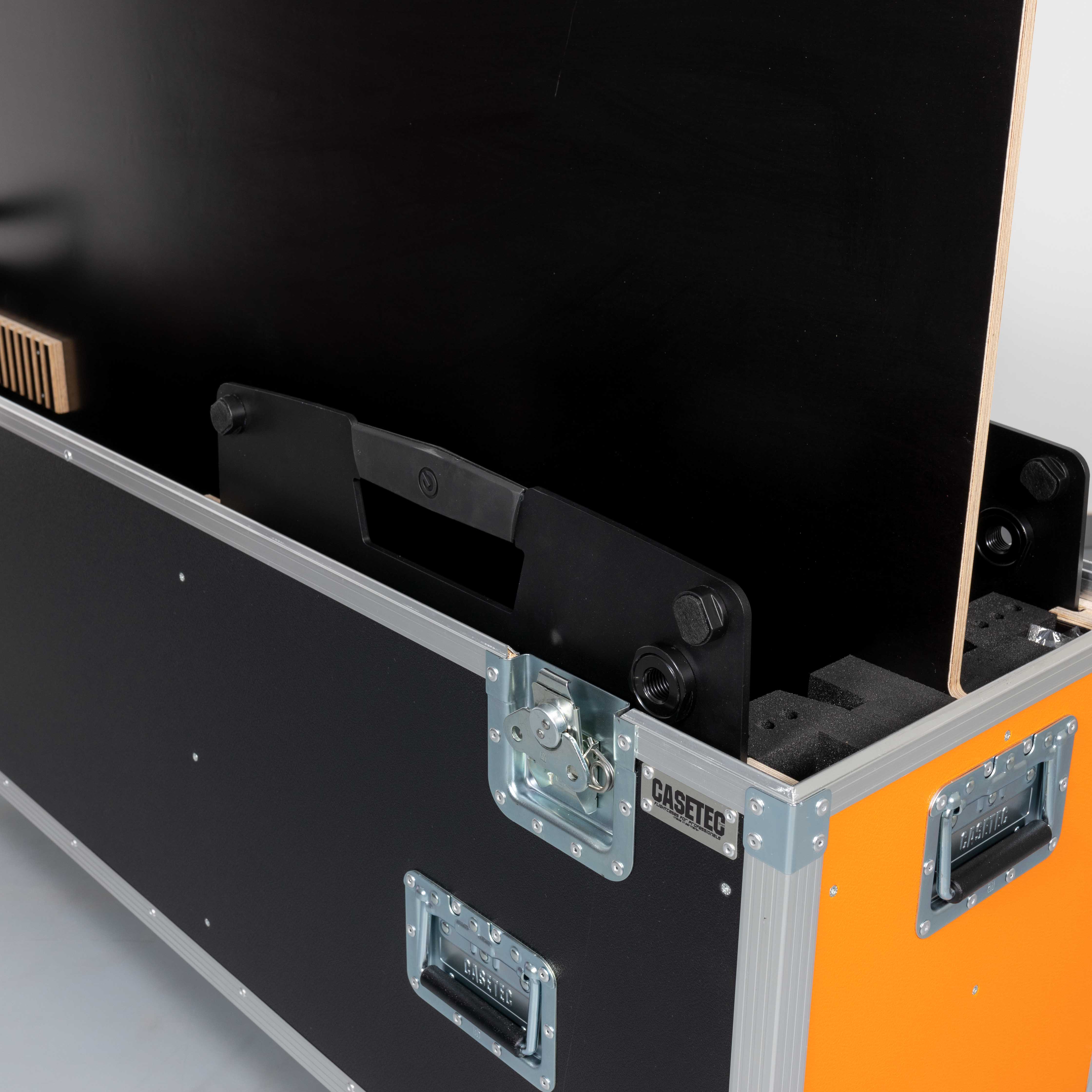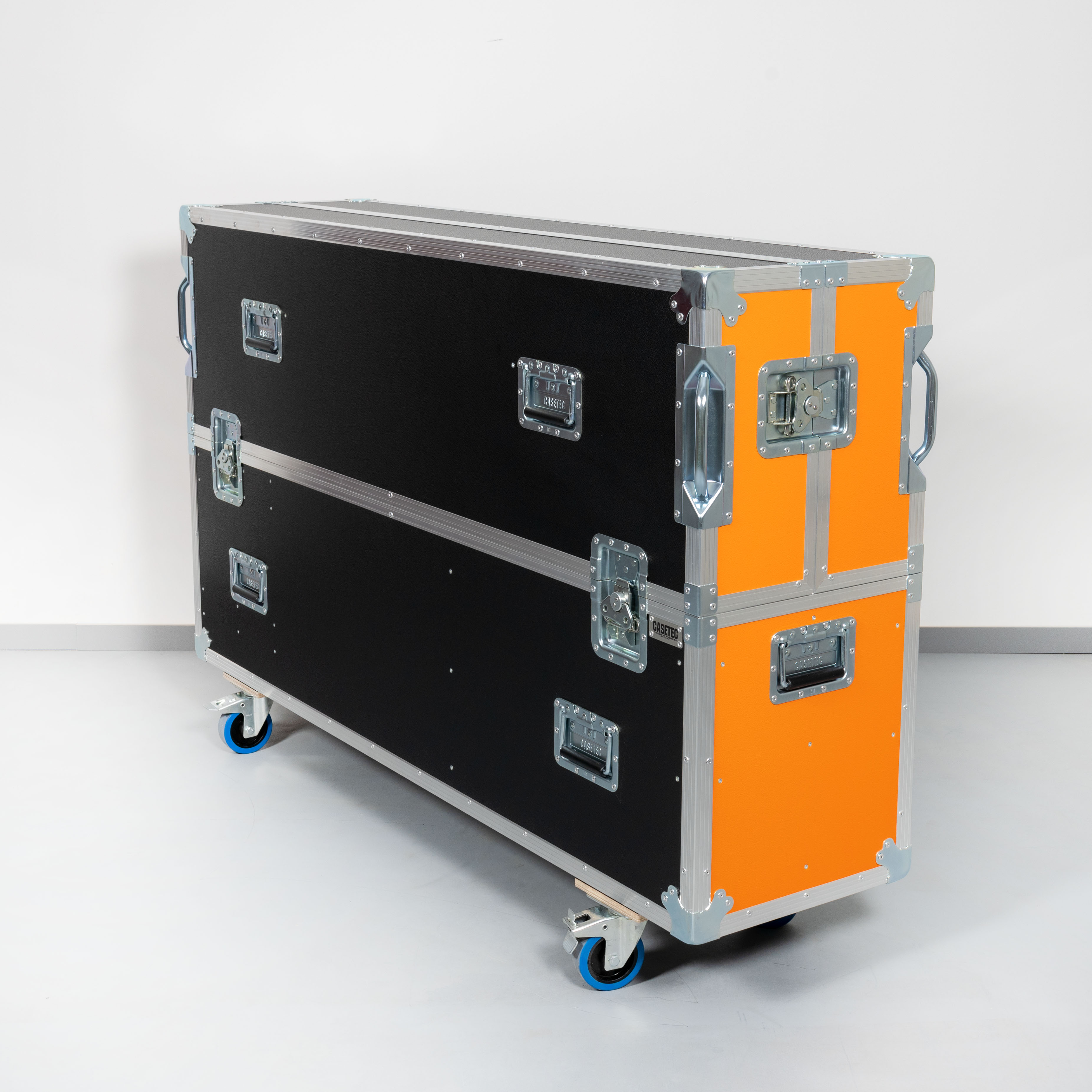 Bauart: geteilte Haube zum Abnehmen, innen punktuell mit Hartschaum ausgepolstert, in den Haubenteilen mit Aufnahme für Stativrohre, im Unterteil einseitig Schaumstoffaufnahme für Displays 55-65" und einseitig ein variabel verstellbarer Trennschlitten mit Schaumaufnahme (Maximal mögliche Displaymaße bei 20mm Gerätetiefe BxH 1430x830mm) mittig im Case eine Trennwand, je ein Fach zur Aufnahme der Bodenplatte Farbe: bild zeig Kopfseiten orange / Rest schwarz (Shopbestellungen werden in komplett schwarz geliefert)