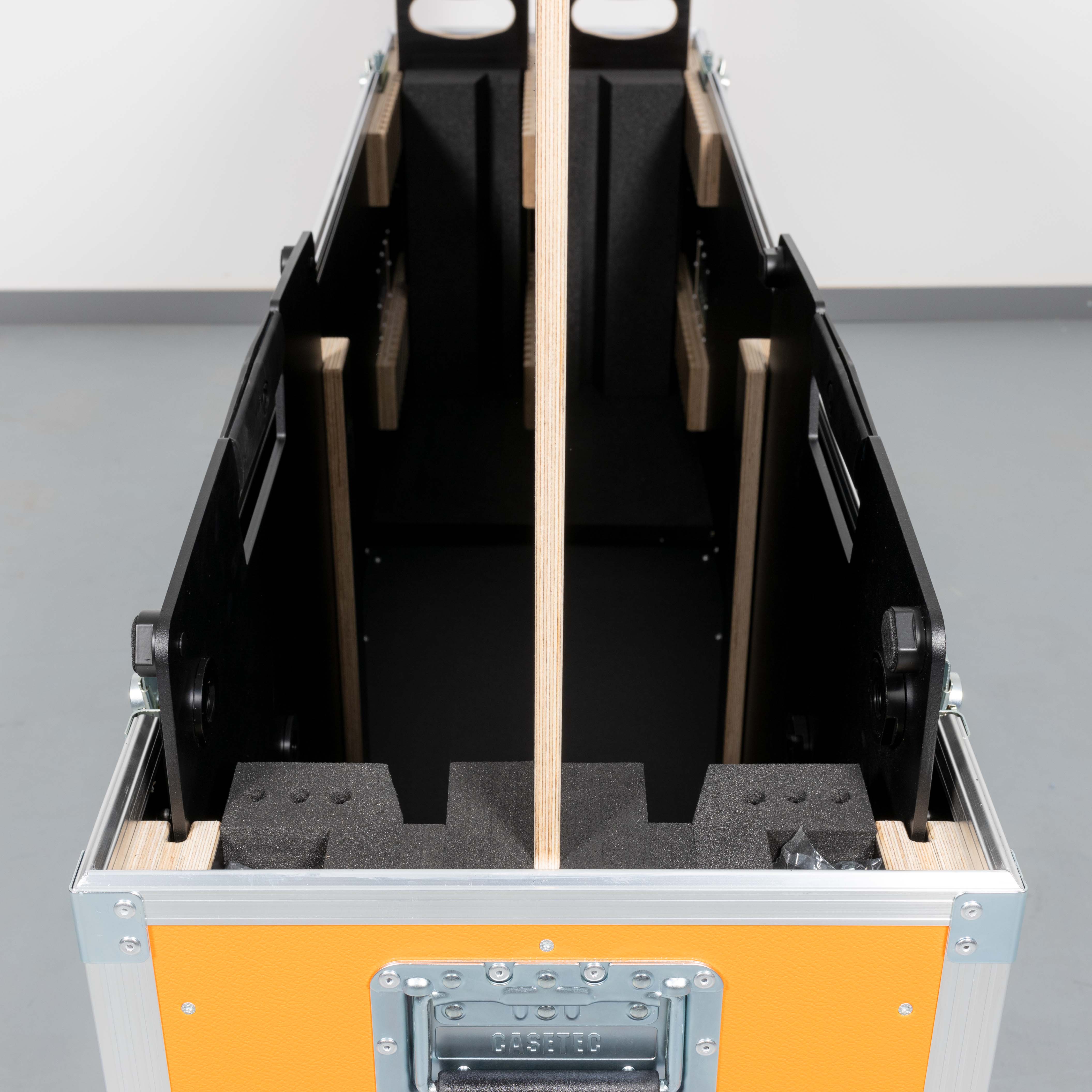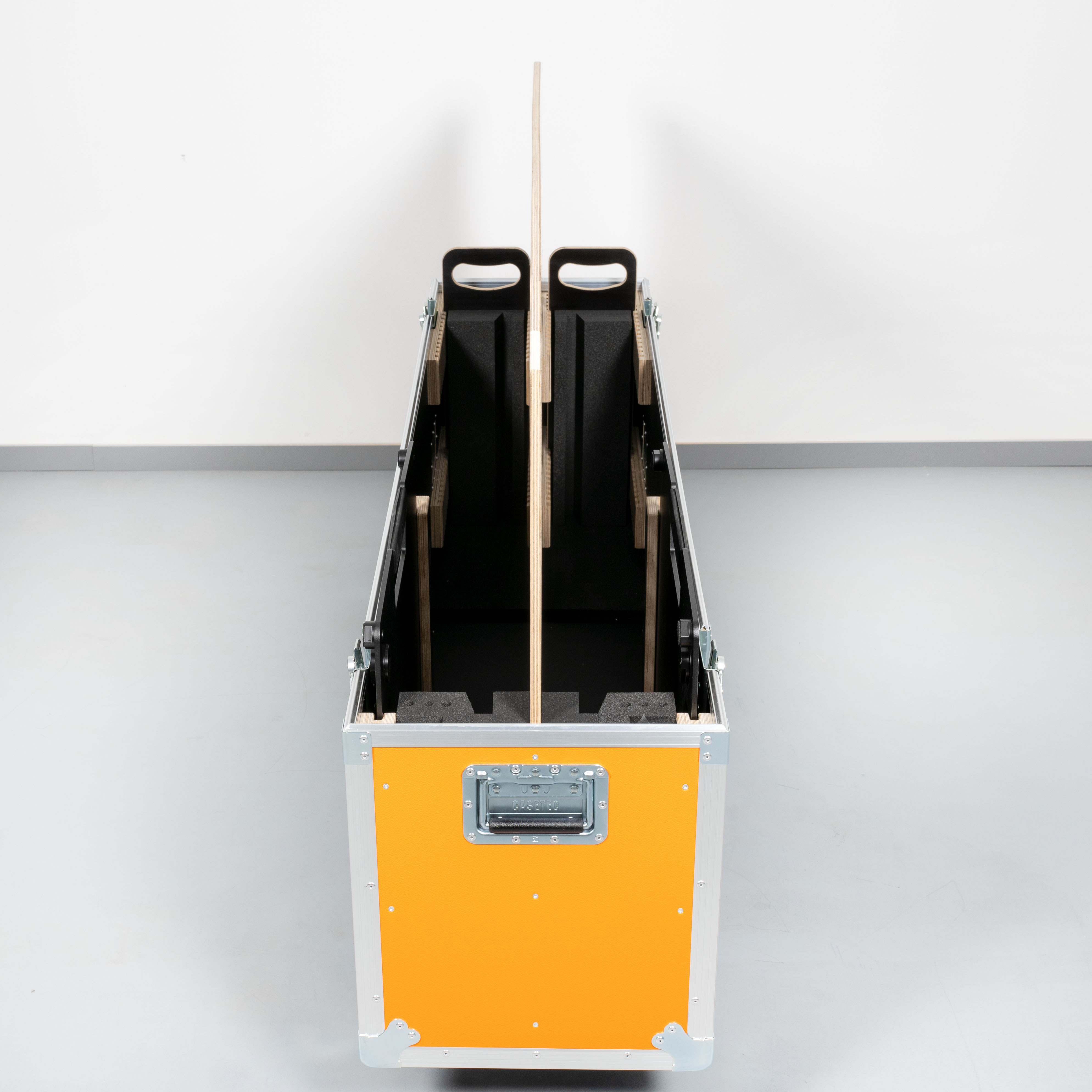 Das Case verfügt über eine geteilte, abnehmbare Haube, die das Be- und Entladen massiv erleichtert. Dank der integrierten Aufnahmen in den Haubenteilen werden die Stativrohre platzsparend verstaut, während die massiven Bodenplatten in separaten, mittig angeordneten Fächern sicher fixiert sind.